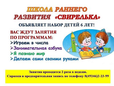 Центр внешкольной работы приглашает ребят 5-6 лет на занятия в Школу раннего развития "Свирелька".